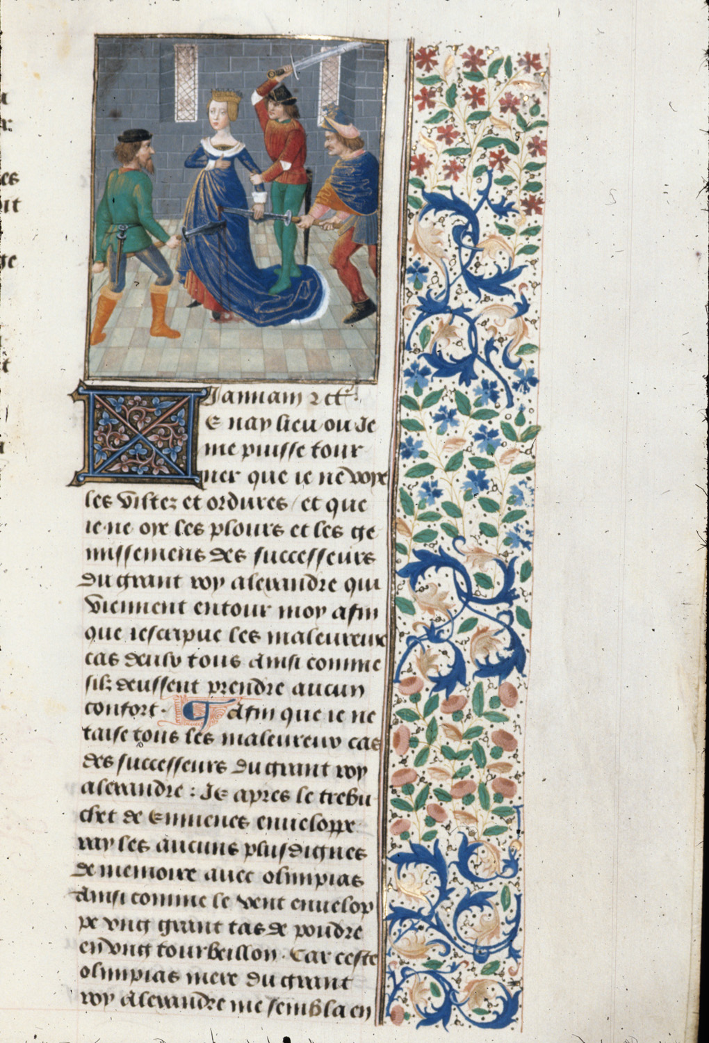 Londra, British Library, Royal 14 E V, f. 202r. Olimpiade viene assassinata da tre uomini.