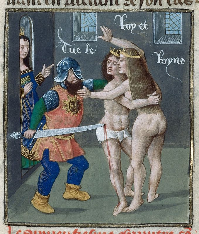 Londra, British Library, Royal 14 E V, f. 227r. Beronice ordina ad un soldato di uccidere Demetrio, mentre Arsinoe tenta di difendere l'amato.