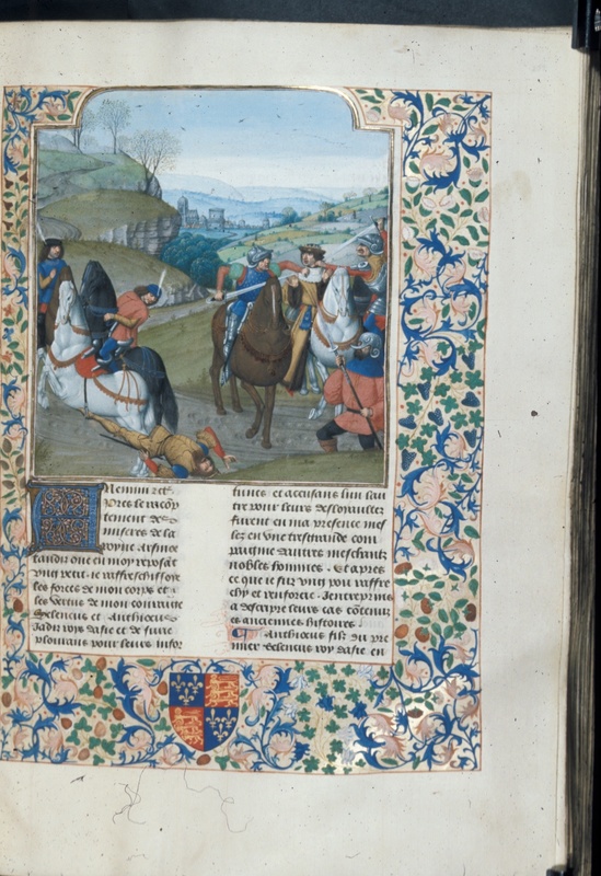 Londra, British Library, Royal 14 E V, f. 233r. Seleuco cade da cavallo; Antioco viene aggredito da tre uomini armati.