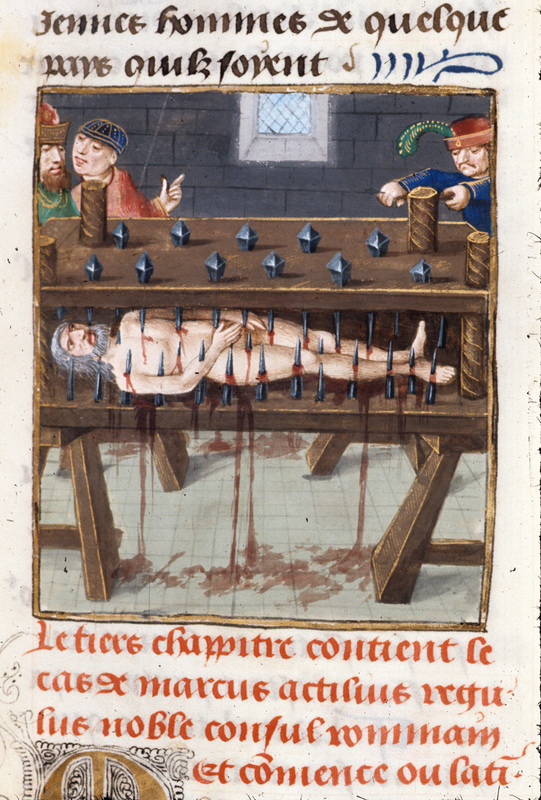 Londra, British Library, Royal 14 E V, f. 239r. Attilio Regolo viene torturato tra due assi chiodate.
