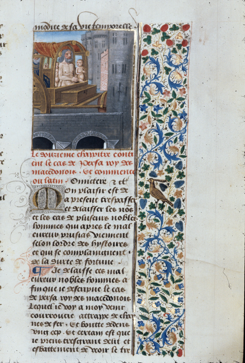 Londra, British Library, Royal 14 E V, f. 270r. Paolo Emilio fa sfilare Perseo ed i suoi figli su un carro durante la processione per il suo trionfo.