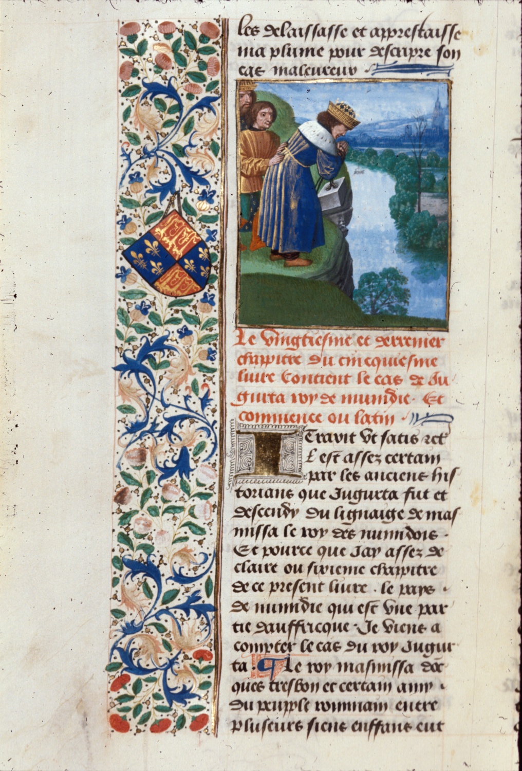 Londra, British Library, Royal 14 E V, f. 287v. Giugurta, legato ad un peso, viene gettato dalla rupe Tarpea.