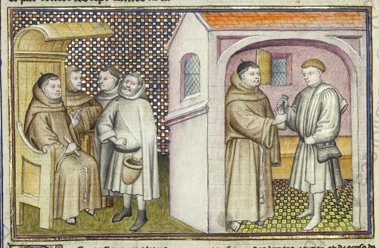 Città del Vaticano, Biblioteca Apostolica Vaticana, Pal. lat. 1989, f. 23v. Il copista del manoscritto, datato 15 giugno 1414, è Laurent de Premierfait. Un uomo viene interrogato da un frate inquisitore; l'inquisitore riceve di nascosto del denaro.