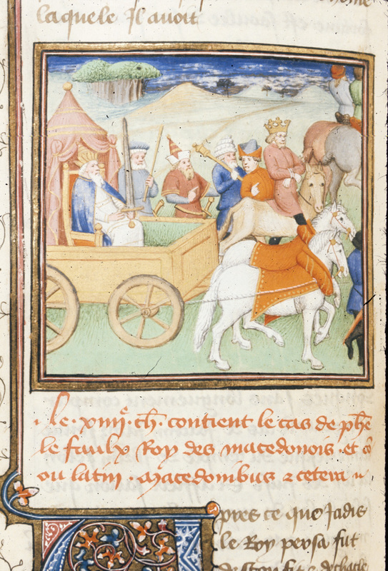 Londra, British Library, Royal 20 C IV, f. 186v. Cecilio Metello conduce Andrisco prigioniero su un carro durante il suo trionfo.
