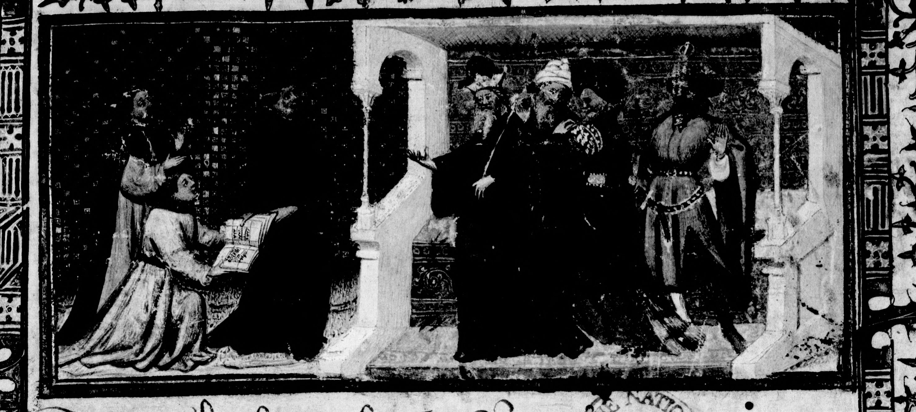 Parigi, Bibliothèque Nationale de France, Fr. 24289, f. 1r. Laurent de Premierfait, accompagnato dall'autore Giovanni Boccaccio vestito da chierico, offre il libro ad un nobile committente circondato da tre principi.
