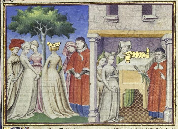 Città del Vaticano, Biblioteca Apostolica Vaticana, Pal. lat. 1989, f. 31v. Il copista del manoscritto, datato 15 giugno 1414, è Laurent de Premierfait. L'anziano Alberto da Bologna osserva Margherita dei Ghisolieri danzare con un gruppo di giovani; invitato in casa della donna, Alberto spiega la natura del suo amore grazie all'esempio del porro.