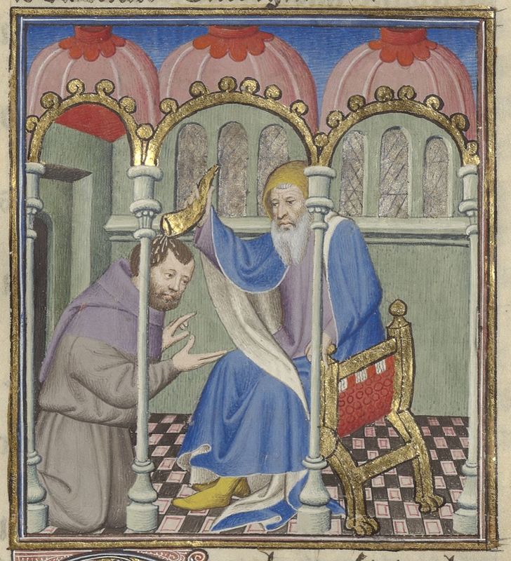 Parigi, Bibliothèque de l'Arsenal, 5193, f. 49r. Samuele consacra Saul re ungendogli il capo con l'olio santo.
