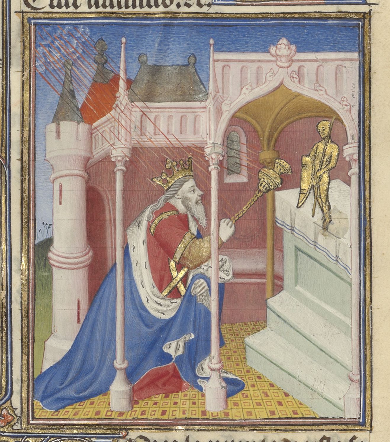 Parigi, Bibliothèque de l'Arsenal, 5193, f. 90v. Tullo Ostilio viene colpito dal fulmine divino mentre offre dell'incenso a un altare.