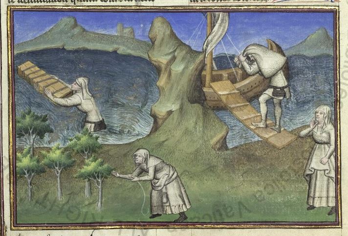 Città del Vaticano, Biblioteca Apostolica Vaticana, Pal. lat. 1989, f. 43v. Il copista del manoscritto, datato 15 giugno 1414, è Laurent de Premierfait. Landolfo Rufolo, salvatosi dal naufragio aggrappato ad una cassa, viene tirato a riva da una donna; Landolfo, recuperate le sue ricchezze, lascia la donna e salpa nuovamente verso casa.