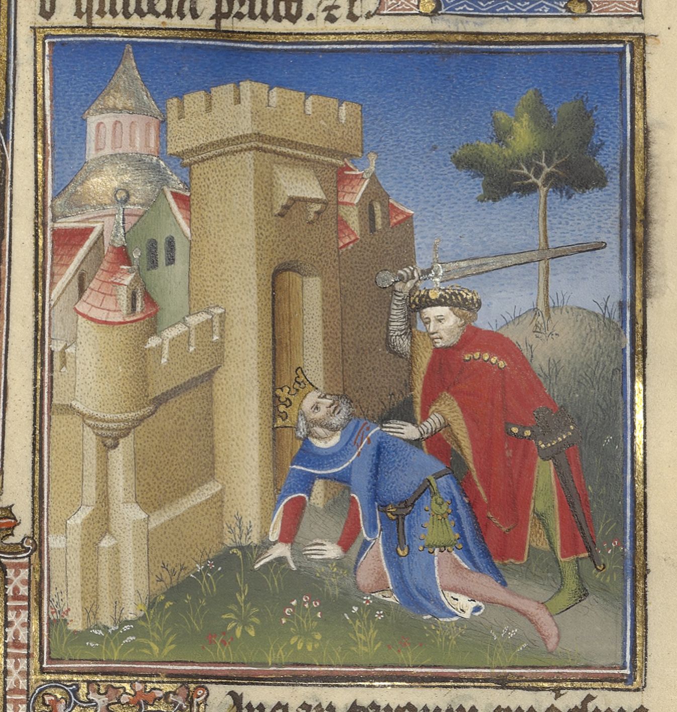 Parigi, Bibliothèque de l'Arsenal, 5193, f. 93v. Lucio Tarquinio uccide Servio Tullio alle porte della città.