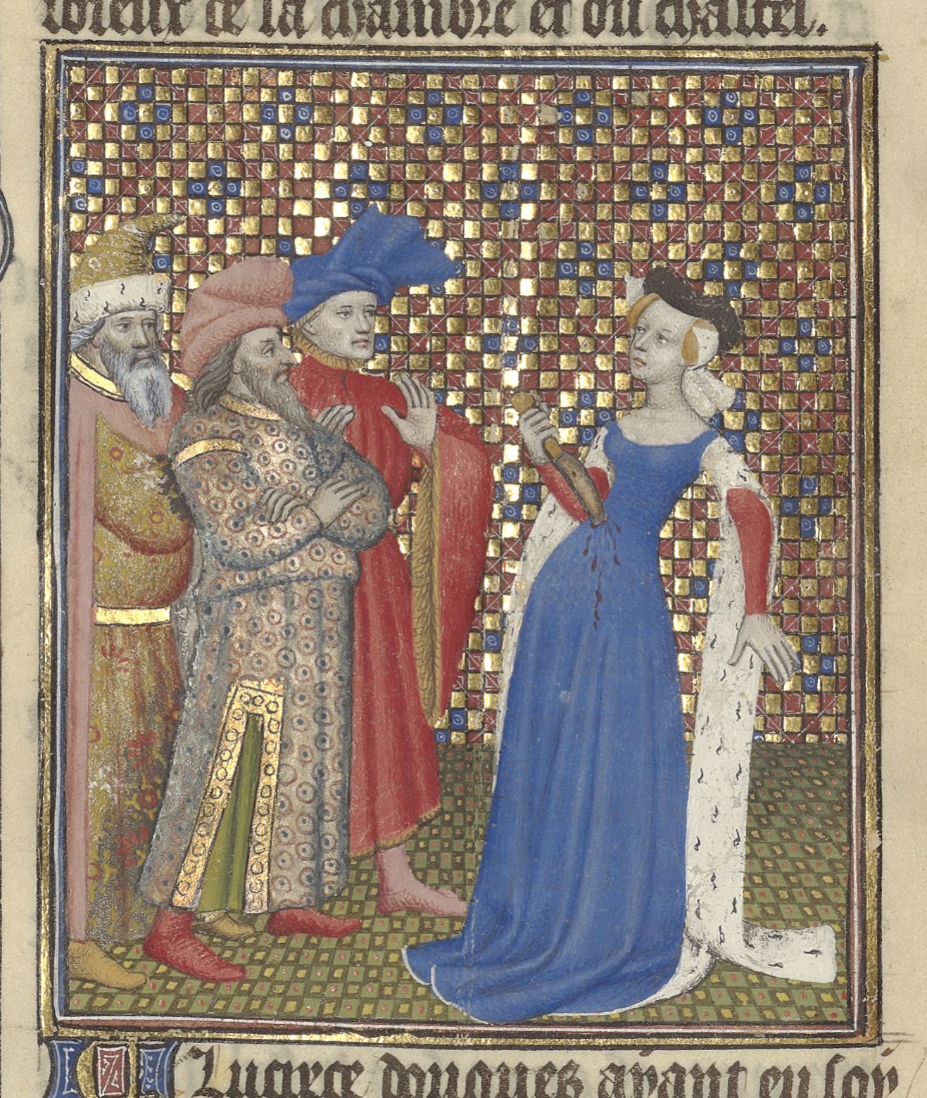 Parigi, Bibliothèque de l'Arsenal, 5193, f. 94v. Lucrezia compie il suicidio dinanzi ai suoi familiari.