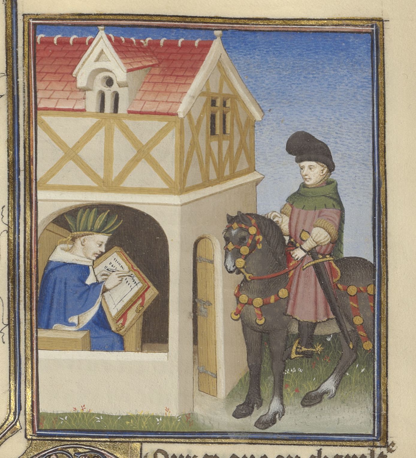 Parigi, Bibliothèque de l'Arsenal, 5193, f. 123v. Un cavaliere si presenta alla porta di un poeta incoronato d'alloro e intento a compilare un manoscritto.