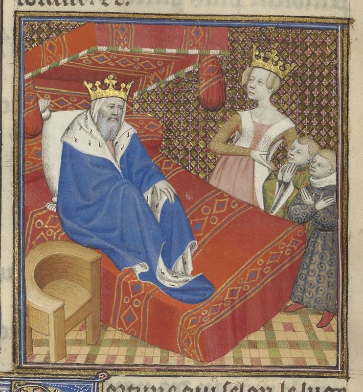 Parigi, Bibliothèque de l'Arsenal, 5193, f. 162v. Agatocle sul letto di morte ordina alla moglie e ai figli di fuggire in Egitto.
