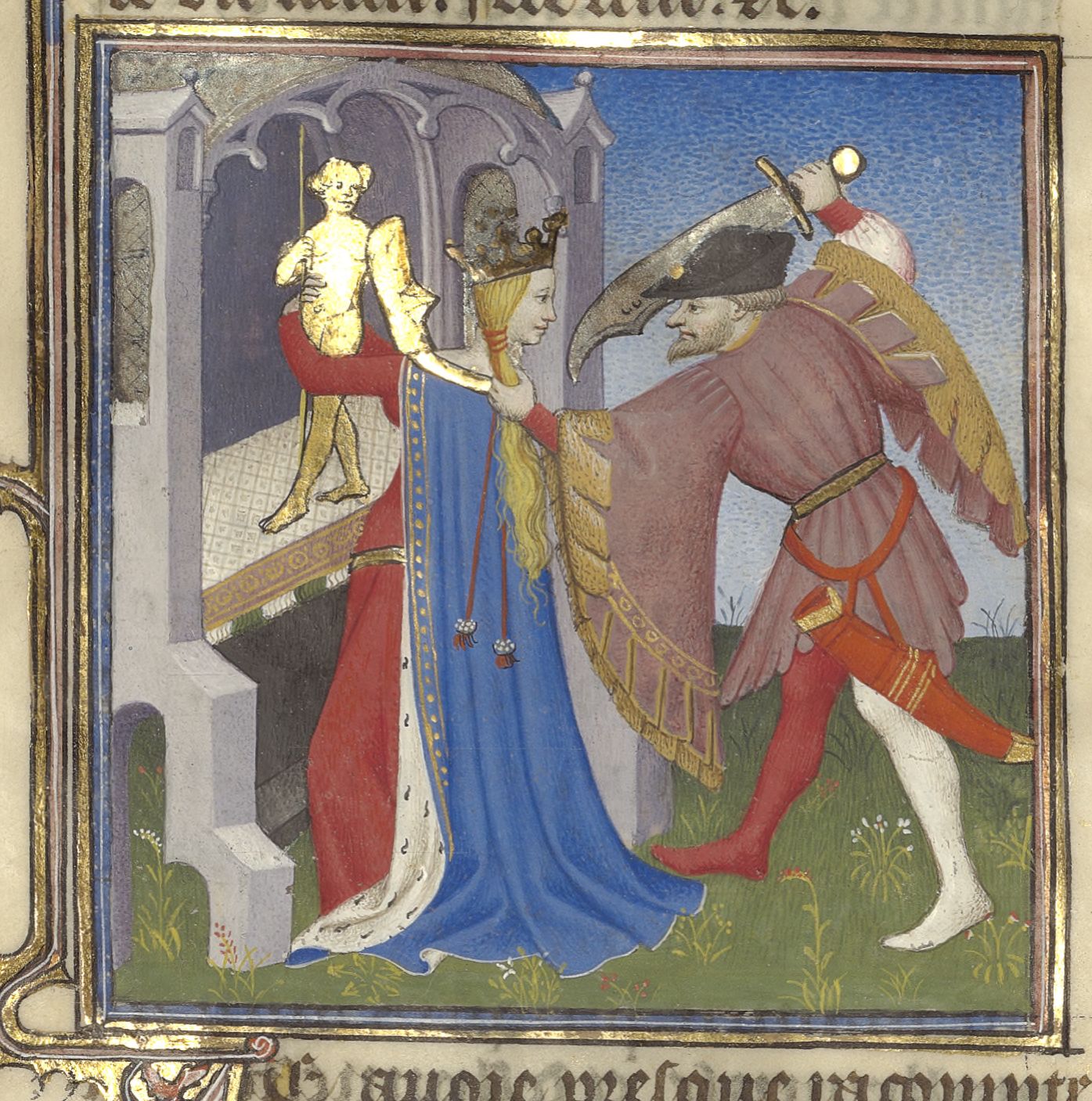 Parigi, Bibliothèque de l'Arsenal, 5193, f. 186v. Deidamia, rifugiatasi nel tempio di Diana, viene raggiunta da Milone e uccisa.
