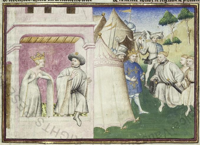 Città del Vaticano, Biblioteca Apostolica Vaticana, Pal. lat. 1989, f. 65r. Il copista del manoscritto, datato 15 giugno 1414, è Laurent de Premierfait. La moglie del re di Francia si strappa le vesti per accusare Gualtieri, conte d'Aversa, di averla violentata, mentre il conte stesso si dà alla fuga; il nuovo re di Francia restituisce titoli e ricchezze a Gualtieri ed ai suoi figli.
