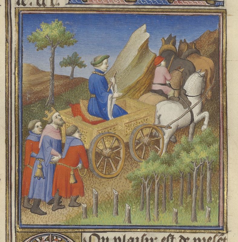 Parigi, Bibliothèque de l'Arsenal, 5193, f. 213r. Lucio Emilio Paolo durante il suo trionfo esibisce il re Perseo ed i suoi figli prigionieri.