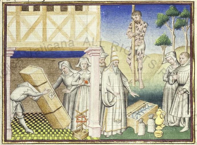 Maestro della Cité des Dames (1414-1419), Ambrogiuolo si fa portare in casa di Bernabò dentro una cassa; Ambrogiuolo viene punito per il suo inganno