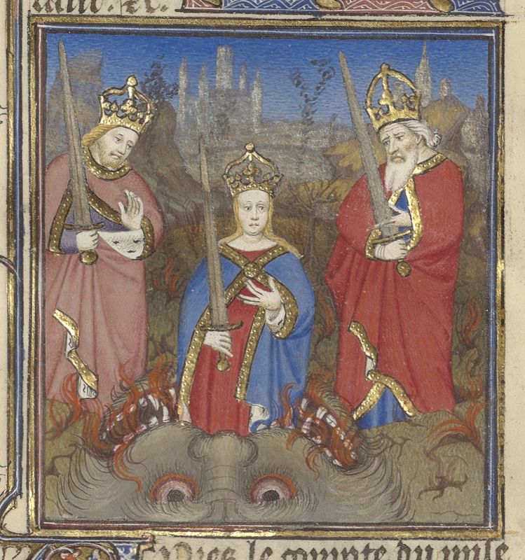 Parigi, Bibliothèque de l'Arsenal, 5193, f. 283v. Tiberio, Caligola e Messalina all'entrata degli Inferi, rappresentata come la bocca di un mostro da cui scaturiscono fiamme.