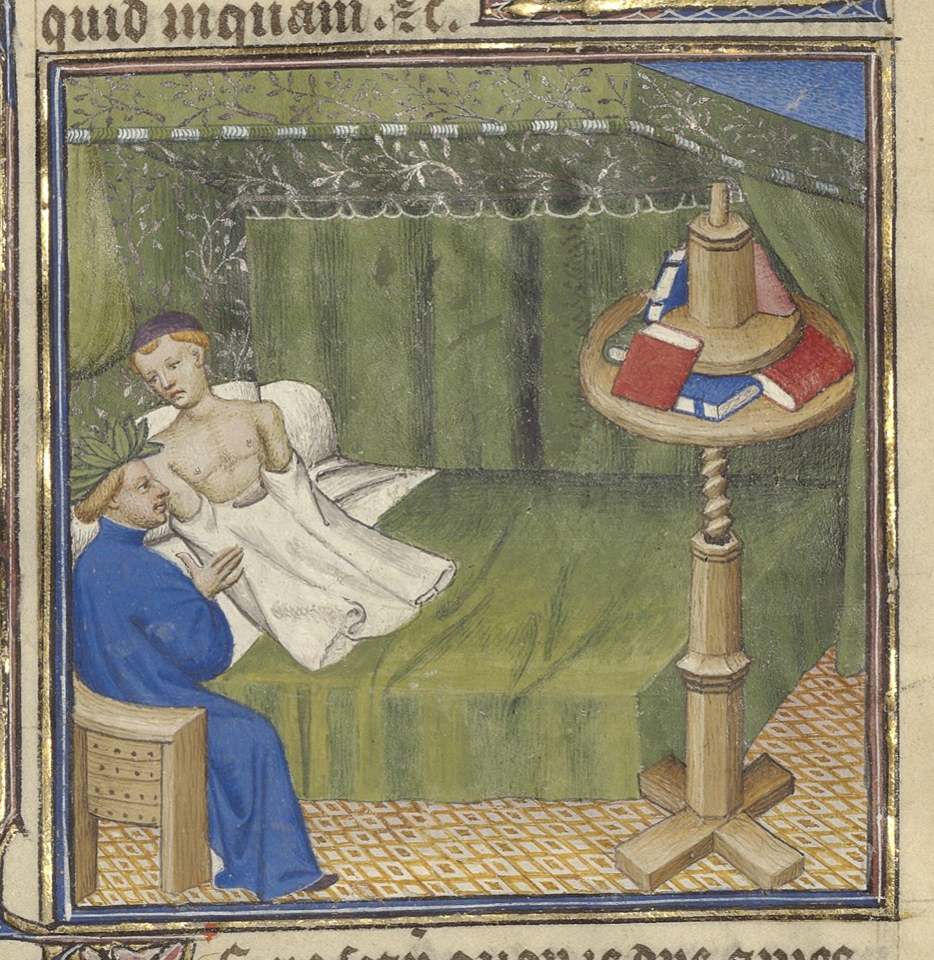 Parigi, Bibliothèque de l'Arsenal, 5193, f. 311r. Francesco Petrarca, coronato di alloro, appare in sogno a Giovanni Boccaccio.