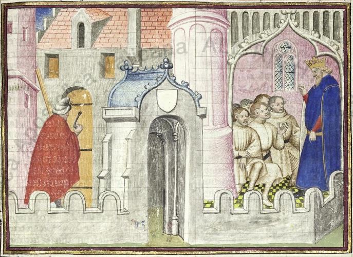 Città del Vaticano, Biblioteca Apostolica Vaticana, Pal. lat. 1989, f. 85r. Il copista del manoscritto, datato 15 giugno 1414, è Laurent de Premierfait. Un palafreniere si traveste come il re per introdursi nelle stanze della regina; il re cerca il colpevole del tradimento tra i servi inginocchiati al suo cospetto.