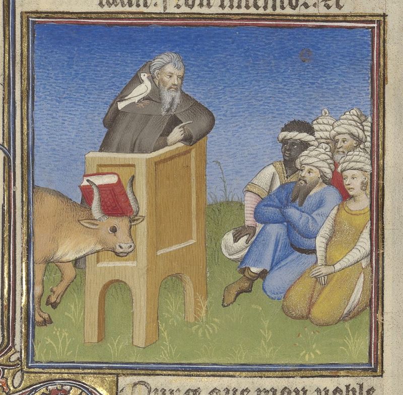 Parigi, Bibliothèque de l'Arsenal, 5193, f. 357v. Maometto, con la colomba che gli sussurra all'orecchio, predica ad una folla di fedeli seduta dinanzi a lui sul prato, accanto ad un bue con il Corano legato alle corna.