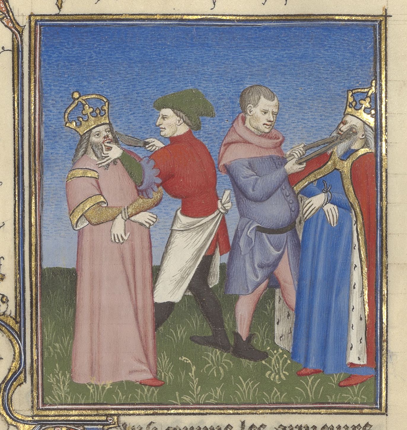 Parigi, Bibliothèque de l'Arsenal, 5193, f. 368r. Giustiniano II e Filippico vengono mutilati da due aguzzini.
