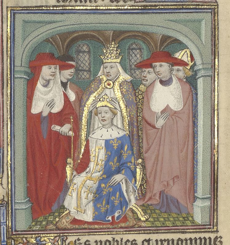 Parigi, Bibliothèque de l'Arsenal, 5193, f. 386r. Carlo d'Angiò viene incoronato da papa Clemente IV.