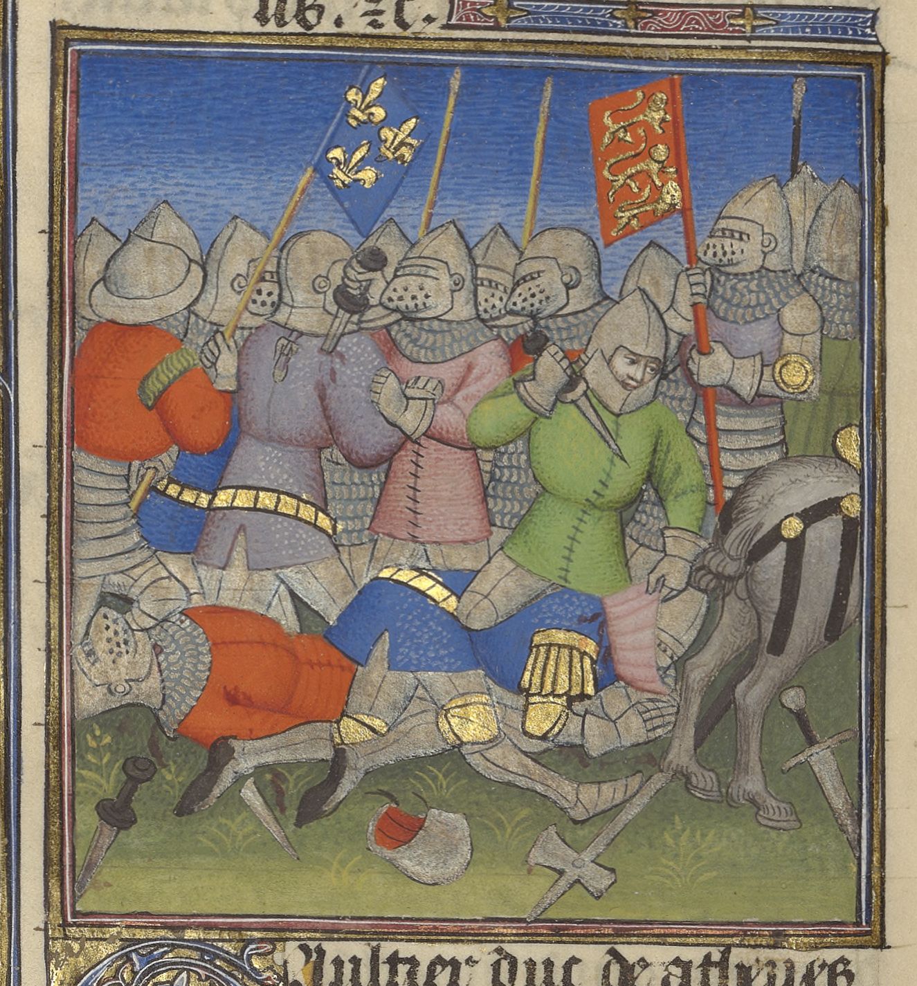 Parigi, Bibliothèque de l'Arsenal, 5193, f. 395v. Gualtieri di Brienne, duca d'Atene, viene ucciso durante la battaglia di Poitiers.