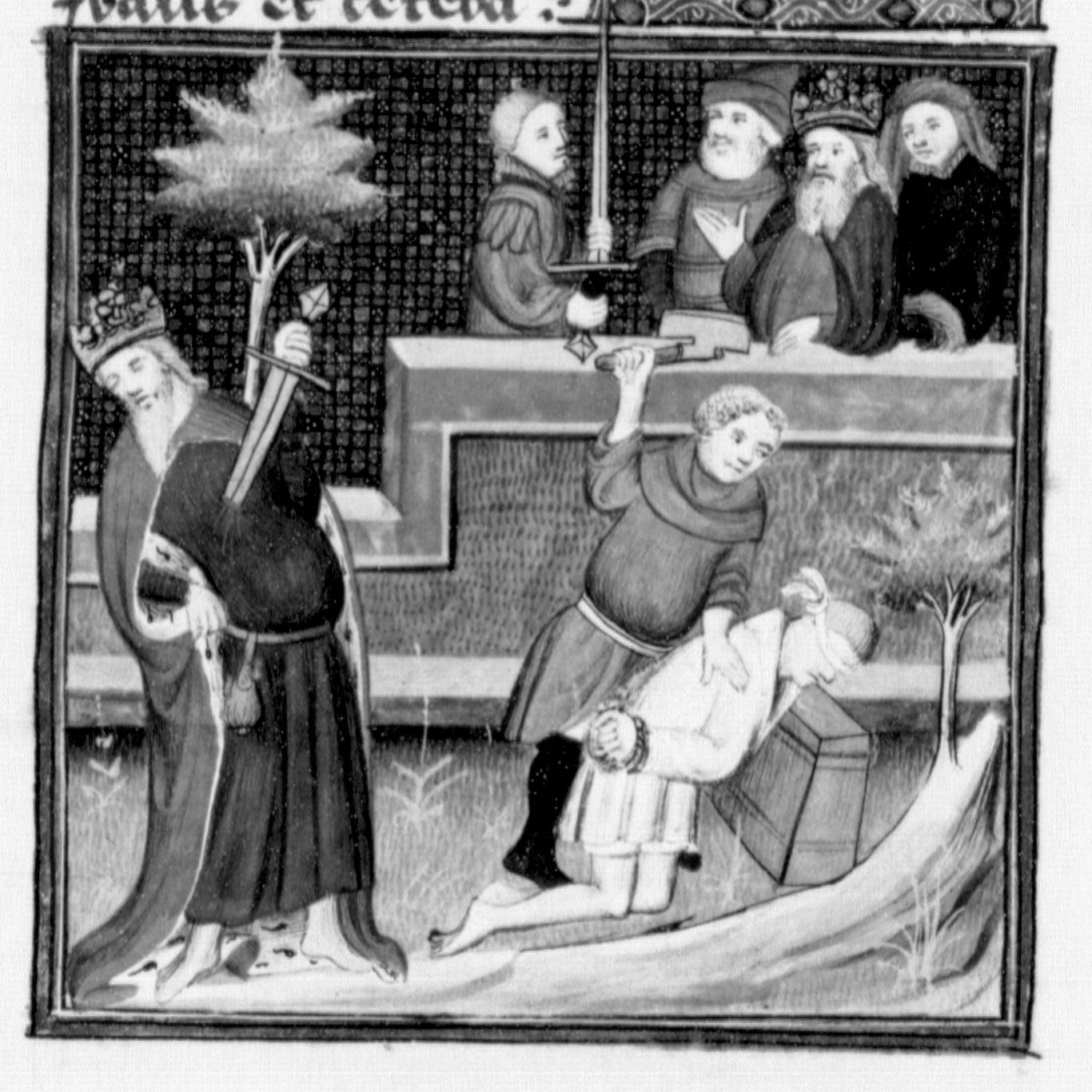 Parigi, Bibliothèque Nationale de France, Fr. 131, f. 40v. Saul compie il suicidio trafiggendosi con la spada; Davide ordina l'esecuzione degli Amaleciti.