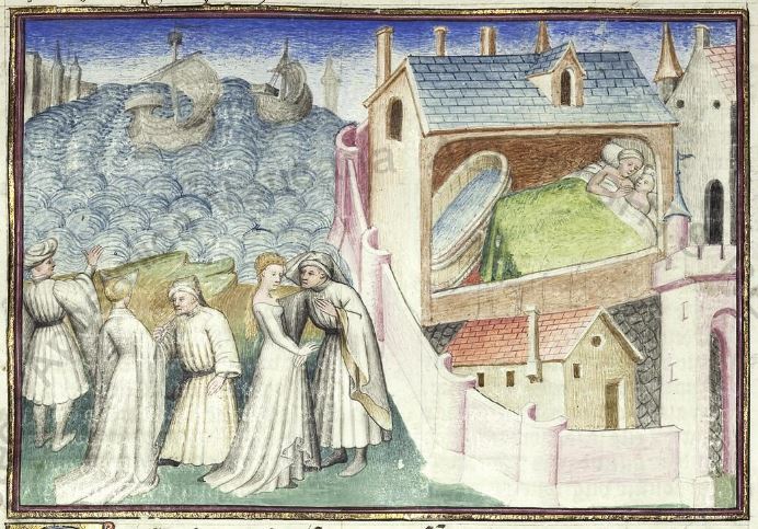 Città del Vaticano, Biblioteca Apostolica Vaticana, Pal. lat. 1989, f. 97r. Il copista del manoscritto, datato 15 giugno 1414, è Laurent de Premierfait. Un gruppo di nobili napoletani, tra cui Ricciardo Minutolo e Catella, si incontra sulla riva del mare; Ricciardo e Catella giacciono insieme nei bagni cittadini.