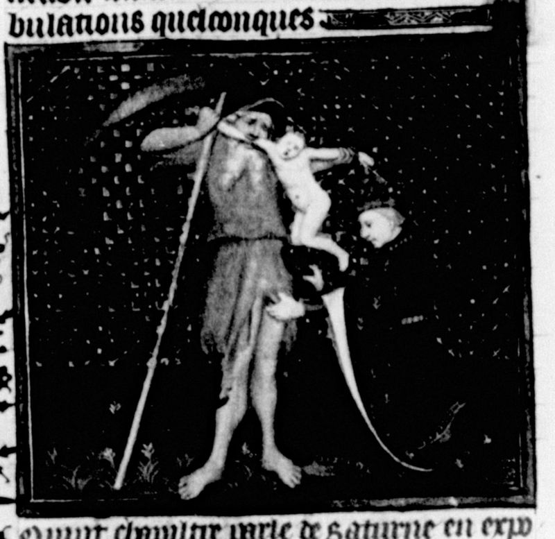 Parigi, Bibliothèque Nationale de France, Fr. 226, f. 9v. Saturno, reggendo una falce con il braccio, divora uno dei suoi figli neonati, mentre un personaggio tenta di fermarlo.