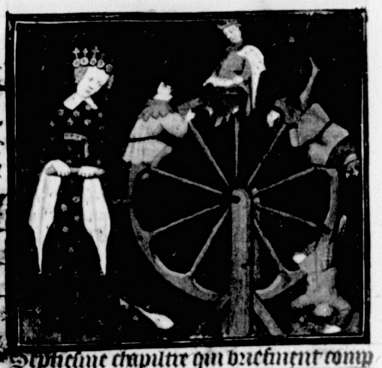 Parigi, Bibliothèque Nationale de France, Fr. 226, f. 12v. La Fortuna, rappresentata come una regina, gira la ruota che determina le sorti degli uomini.