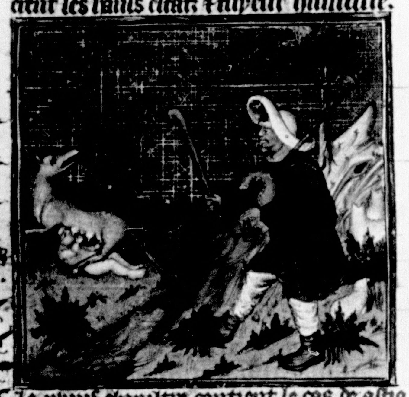 Parigi, Bibliothèque Nationale de France, Fr. 226, f. 52v. Un pastore trova il giovane Ciro allattato da una cagna.