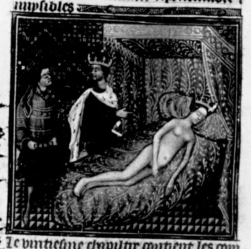 Parigi, Bibliothèque Nationale de France, Fr. 226, f. 56r. Re Candaule mostra a Gige la bellezza della moglie addormentata.