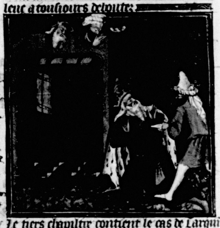 Parigi, Bibliothèque Nationale de France, Fr. 226, f. 66v. Lucio Tarquinio uccide Servio Tullio alle porte della città.
