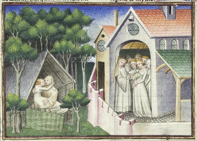 Città del Vaticano, Biblioteca Apostolica Vaticana, Pal. lat. 1989, f. 114r. Il copista del manoscritto, datato 15 giugno 1414, è Laurent de Premierfait. Alibech giace con l'eremita Rustico; la fanciulla si unisce in matrimonio con Neerbale.