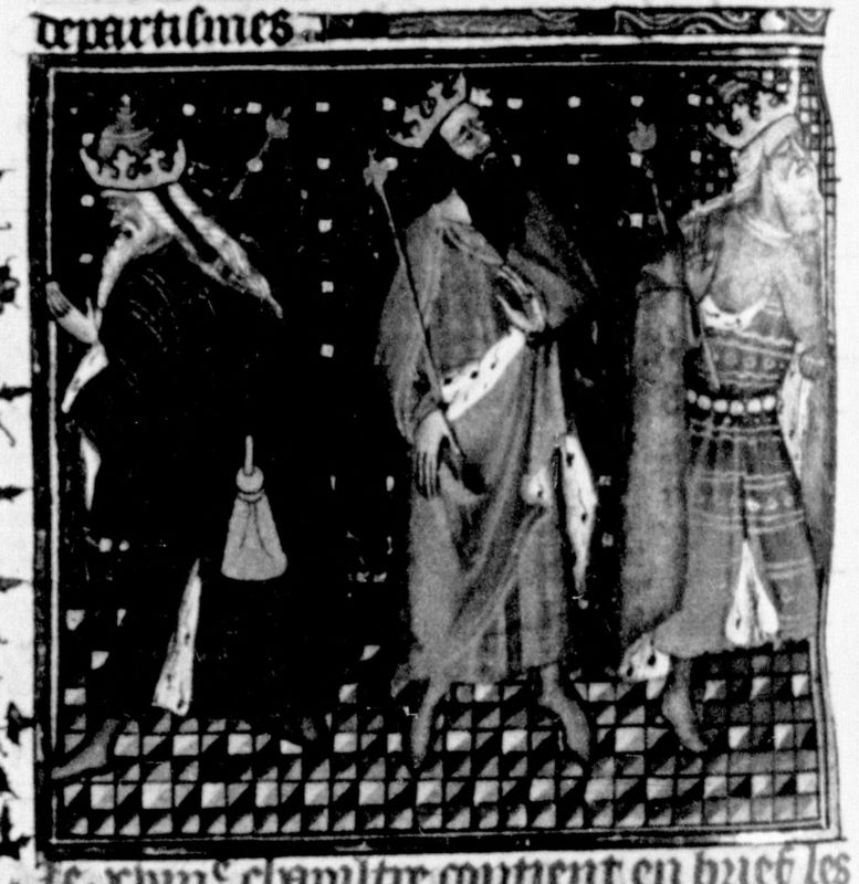 Parigi, Bibliothèque Nationale de France, Fr. 226, f. 91v. Evagorace re di Cipro, Teo re d'Egitto e Aminta re di Macedonia in atteggiamento dolente.