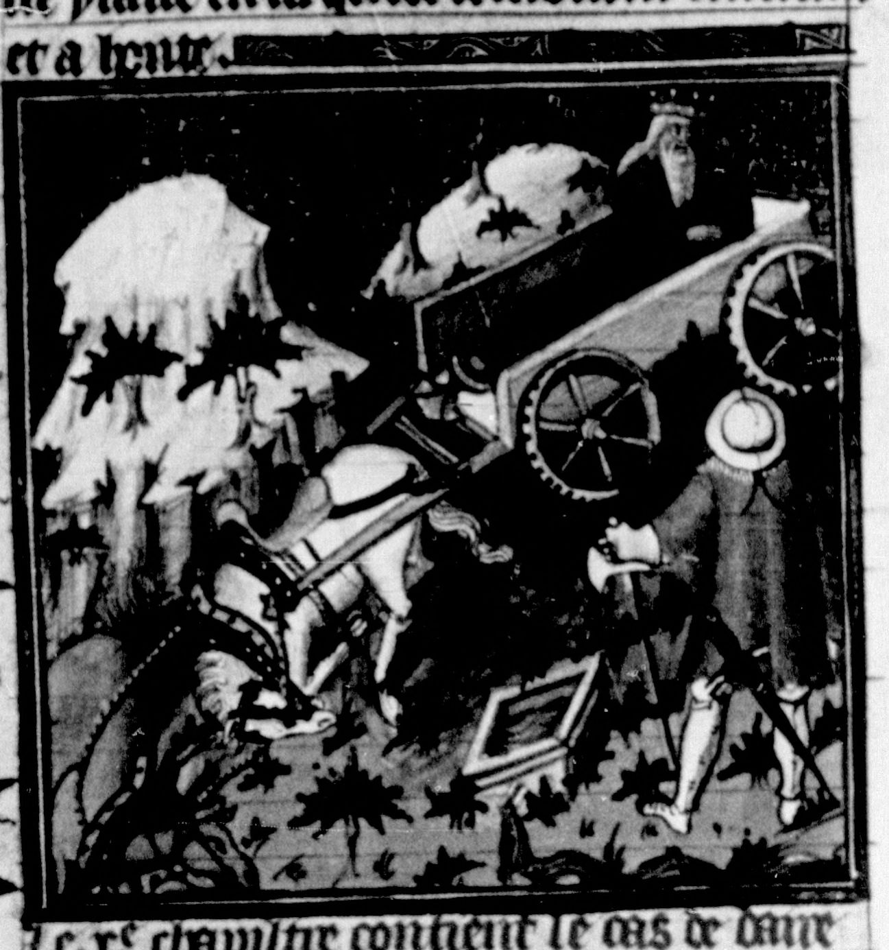 Parigi, Bibliothèque Nationale de France, Fr. 226, f. 104v. Dario re di Persia, posto in ceppi su un carro, detta ad un soldato le sue ultime volontà.