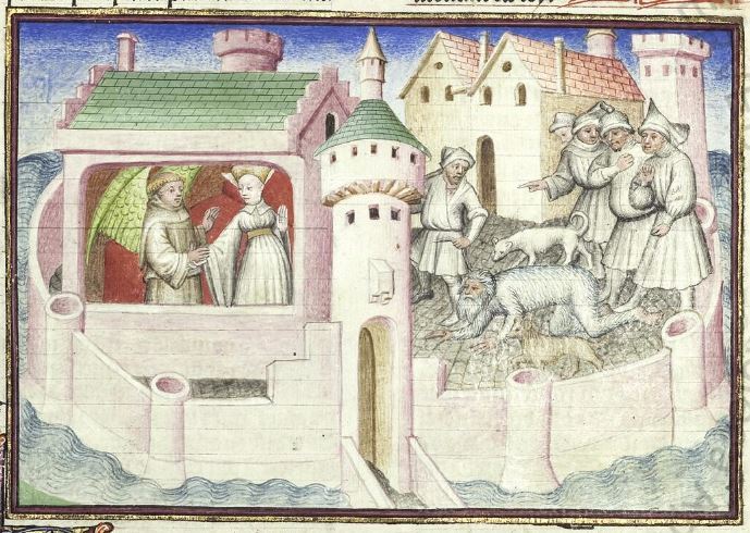Città del Vaticano, Biblioteca Apostolica Vaticana, Pal. lat. 1989, f. 124v. Il copista del manoscritto, datato 15 giugno 1414, è Laurent de Premierfait. Frate Alberto, travestito da angelo Gabriele, visita madonna Lisetta; Alberto, vestito da uomo selvatico, viene trascinato per strada e vituperato dalla folla.
