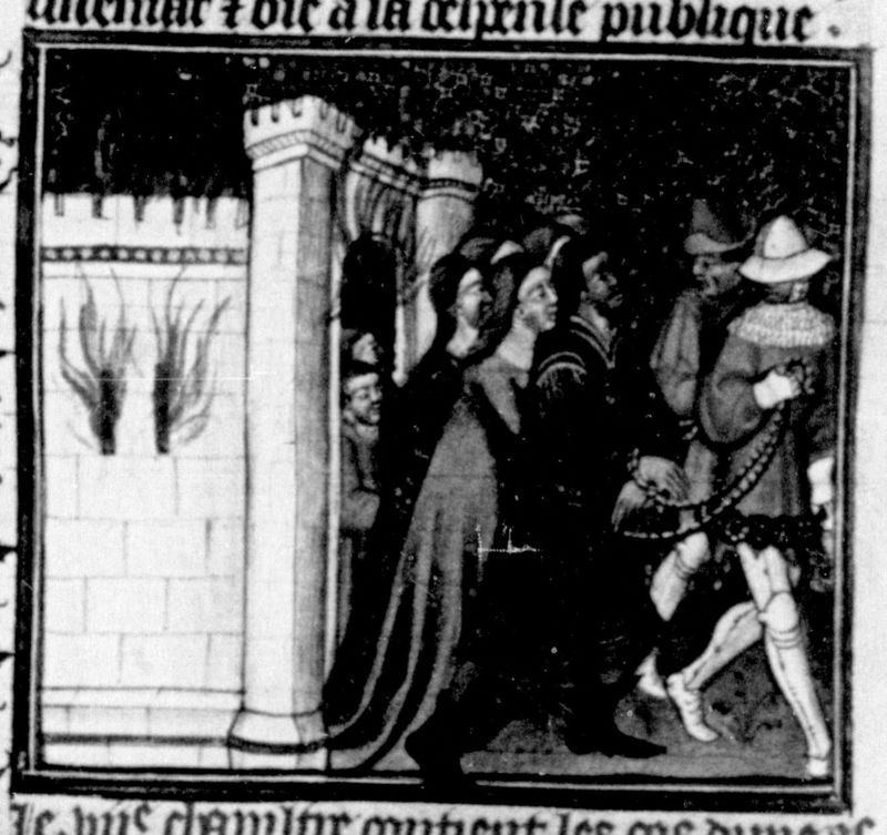 Parigi, Bibliothèque Nationale de France, Fr. 226, f. 134r. L'esercito romano trascina i prigionieri cartaginesi fuori dalla città.