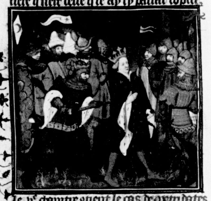 Parigi, Bibliothèque Nationale de France, Fr. 226, f. 162v. Mitridate del Ponto uccide re Ariarate della Cappadocia in battaglia.