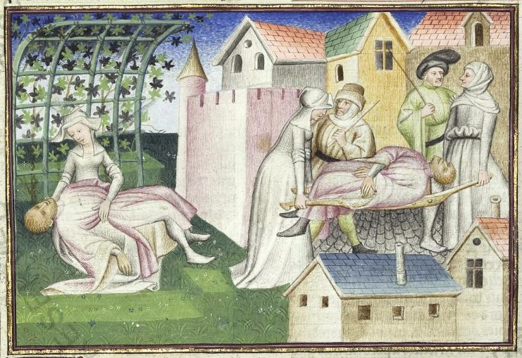 Città del Vaticano, Biblioteca Apostolica Vaticana, Pal. lat. 1989, f. 136r. Il copista del manoscritto, datato 15 giugno 1414, è Laurent de Premierfait. Gabriotto muore tra le braccia di Andreuola; Andreuola e la fantesca, trasportando il corpo di Gabriotto, vengono fermate dal podestà.