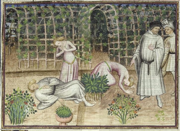 Città del Vaticano, Biblioteca Apostolica Vaticana, Pal. lat. 1989, f. 139r. Il copista del manoscritto, datato 15 giugno 1414, è Laurent de Premierfait. Simona piange sul corpo di Pasquino, avvelenato dalla salvia; per dimostrare la propria innocenza, Simona muore anch'essa avvelenata di fronte al giudice.