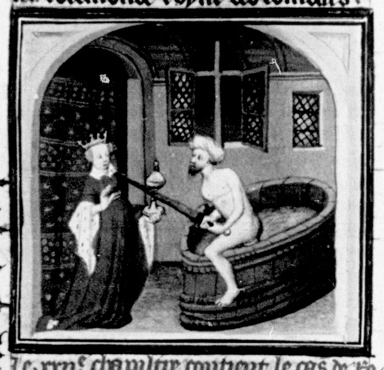 Parigi, Bibliothèque Nationale de France, Fr. 226, f. 240v. Lo scudiero Elmichi, armato di spada, offre una coppa di veleno alla regina Rosmunda mentre esce dal bagno.