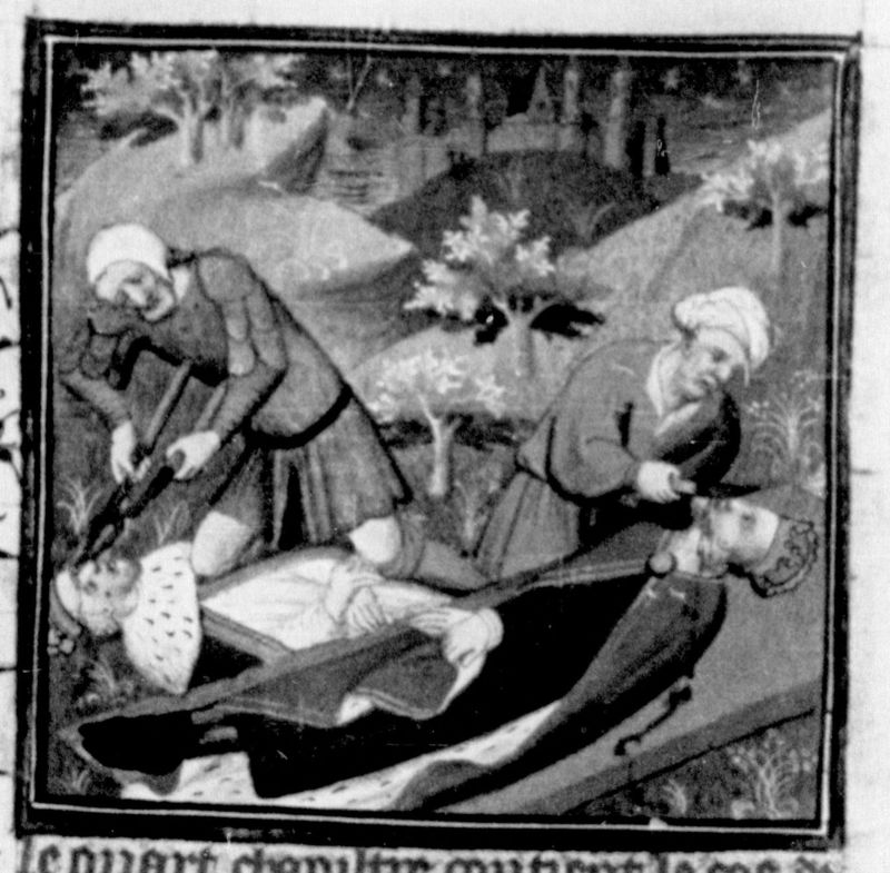 Parigi, Bibliothèque Nationale de France, Fr. 226, f. 250r. Giustiniano II e Filippico vengono mutilati da due aguzzini.
