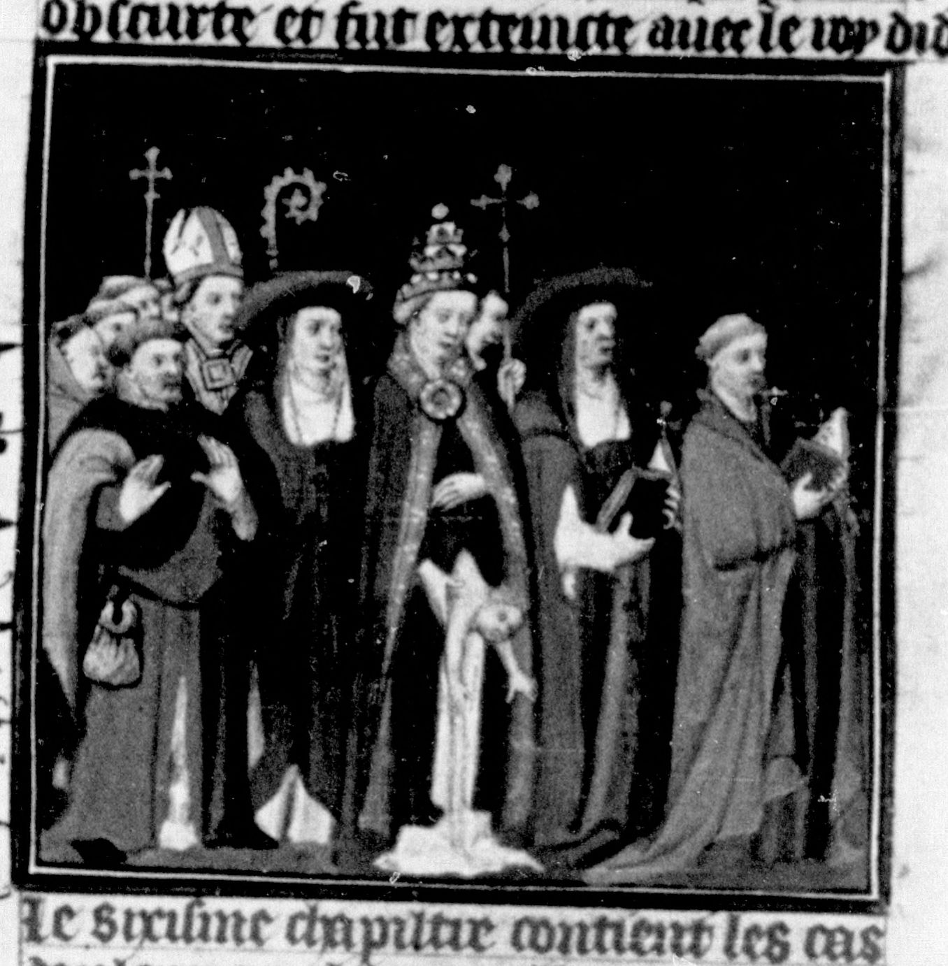 Parigi, Bibliothèque Nationale de France, Fr. 226, f. 252r. La papessa Giovanna partorisce un bambino durante una processione religiosa.
