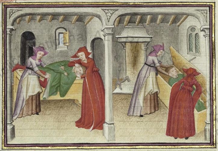 Città del Vaticano, Biblioteca Apostolica Vaticana, Pal. lat. 1989, f. 145v. Il copista del manoscritto, datato 15 giugno 1414, è Laurent de Premierfait. La moglie di Mazzeo scopre il proprio amante Ruggeri addormentato e lo crede morto; con l'aiuto di una serva, la donna nasconde l'amante in un baule.