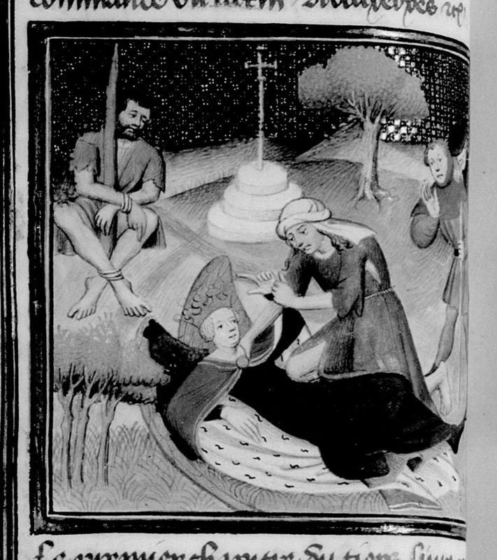 Parigi, Bibliothèque Nationale de France, Fr. 16994, f. 76v. Giunti ad un crocevia due viandanti assistono alla lotta tra la Povertà, rappresentata come una vecchia malvestita, e la Fortuna, una regina alata; la Sfortuna, raffigurata come un uomo vestito di stracci, è legata ad un palo.