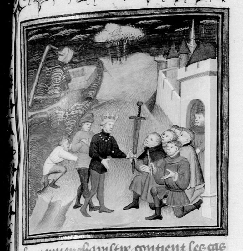 Parigi, Bibliothèque Nationale de France, Fr. 16994, f. 159r. Seleuco sopravvive al naufragio della sua nave e viene accolto come re dalla popolazione, che gli offre in dono una spada.