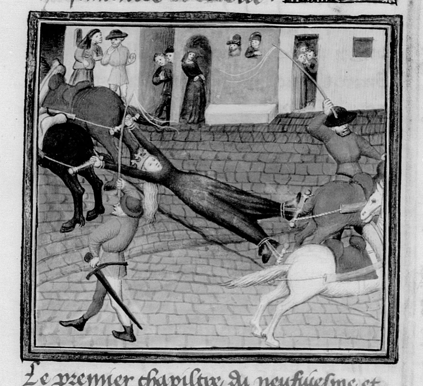 Parigi, Bibliothèque Nationale de France, Fr. 16994, f. 307r. Brunichilde viene legata ai cavalli e squartata da due aguzzini; alcuni uomini e donne assistono alla scena dalle proprie abitazioni.